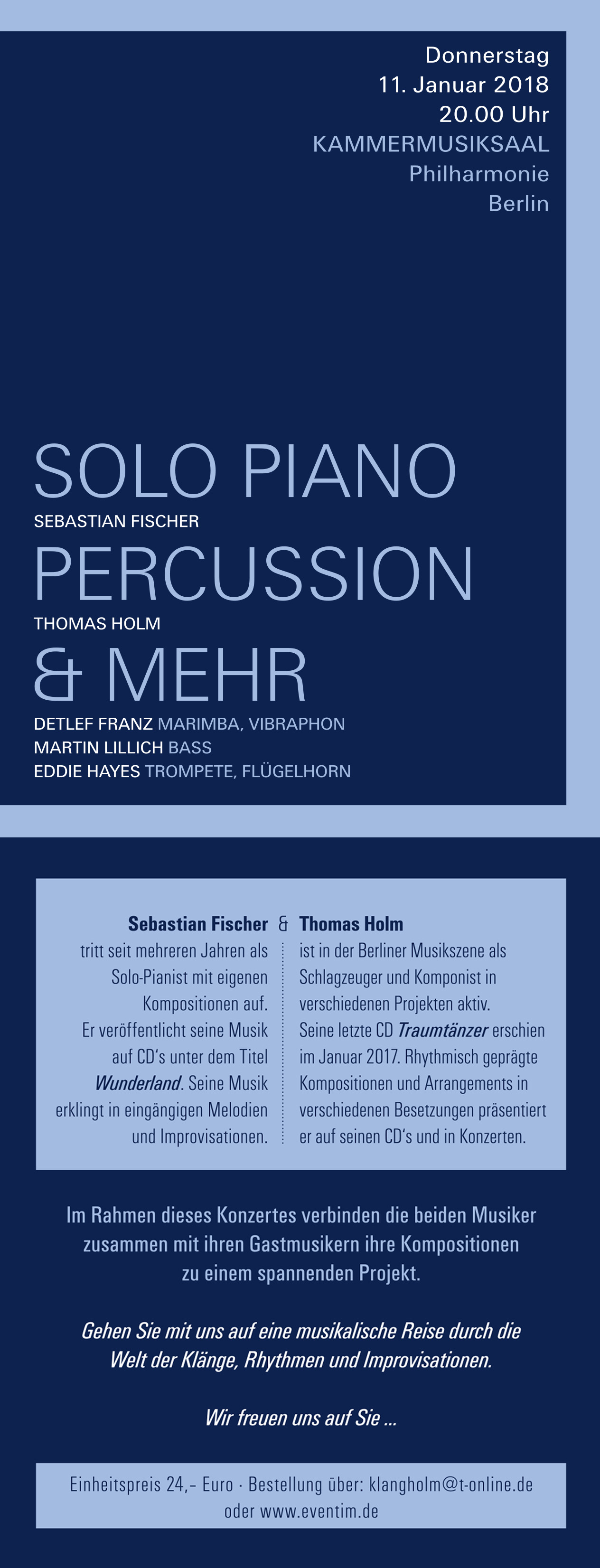 SOLO PIANO Sebastian Fischer PERCUSSION Thomas Holm & MEHR Detlef Franz - Marimba, Vibraphon Martin Lillich - Bass Eddie Hayes - Trompete, Flügelhorn
